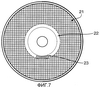 В примере, представленном на фиг.7, основная информационная область 21 (показанная на фигуре штриховкой) находится на внешнем круговом участке оптического диска. На кольцевом участке внутри внешнего кругового участка размещается BCA-область 22 (образуемая областью между двумя кругами, показанными на фигуре пунктирными линиями), которая является вспомогательной информационной областью. В BCA-области 22 в виде рисунка штрих-кода записан идентификационный номер 23 носителя. На металлическую отражающую пленку наносят слой прозрачной смолы, например поликарбоната или т.п., и после этого путем облучения металлической отражающей пленки, которая находится на глубине 0,1 мм от поверхности оптического диска, импульсным лазером (например, YAG-лазер) записывают идентификационные данные (идентификационный номер) 23 носителя. При этом металлическая отражающая пленка, по-видимому, плавится и затем собирается под действием поверхностного натяжения на обеих границах. Таким образом, происходит частичное удаление металлической отражающей пленки и формируются отдельные области без отражающей пленки. В результате создается BCA-область с записанным идентификационным номером носителя, используемым для однозначной идентификации оптического диска.