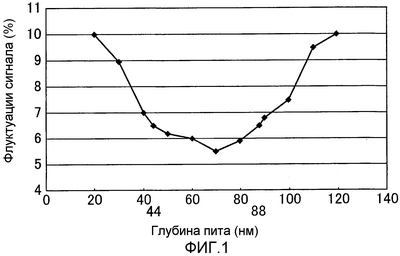 В общем случае для обеспечения допустимых пределов рабочего режима системы флуктуации сигнала не должны превышать 6,5%. Как показано на фиг.1, при глубине пита, заданной в диапазоне значений не менее 44 нм, но не более 88 нм, флуктуации сигнала не превышают 6,5%. При этом показатель преломления n нанесенного слоя смолы составляет 1,53, а длина волны луча света – 405 нм. Поэтому с учетом описанных выше результатов измерений можно видеть, что глубина D пита, позволяющая получить ожидаемый сигнал воспроизведения, составляет не менее /(6×n), но не более /(3×n).