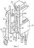 Для этой цели два защитных диода 18 тонкой настройки вставляют в собранном состоянии в соответствующие камеры 44 диэлектрика 14. Аналогичным образом в нижней части диэлектрика 14 расположены камеры 46 для каждого из термисторов 20. Установка защитных диодов 18 в камеры 44 и термисторов 20 в камеры 46 осуществляют через соответствующие отверстия с малым поперечным сечением, направленные в сторону передней части (как показано на фиг.1) защитного соединителя 10. Для обеспечения во вдвинутом состоянии надежного контактирования поверхностей названных последними беспроводных защитных компонентов 18, 20, а также для надежного направления двух других соединительных контактов 48 и 50 камеры 44 и 46 содержат пазы 52, в которые входят и направляются лепестки 32 соединительных контактов 48, 50. Две верхние камеры 44 содержат пазы 52, выполненные в виде боковых отверстий, в то время как две нижние камеры 46 содержат выполненные в виде полосок пазы в двух наружных боковых стенках. Дополнительно к этому камеры 44 и 46 с задней стороны (как показано на фиг.1) также имеют открытые отверстия, значение которых будет пояснено ниже со ссылками на фиг.2. Эти направленные в заднюю сторону отверстия служат применительно к защитным диодам 18 для контактирования с частями контакта 40 заземления и применительно к термистору 20 для контактирования с двумя другими соединительными контактами 26 и 28.
