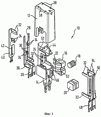 На фиг.1 показан защитный соединитель, обозначенный в целом позицией 10, содержащий кожух 12, в котором в полностью собранном состоянии размещаются защитные компоненты и контакты, расположенные в диэлектрике 14. Защитные компоненты, предусмотренные в показанном примере выполнения, представляют собой защиту от перенапряжений в виде газового разрядника 16, два устройства тонкой настройки для защиты от перенапряжений в виде защитных диодов 18 тонкой настройки и два средства защиты от избыточного тока в виде термисторов 20. В показанном примере выполнения защитные диоды 18 и термисторы 20 являются беспроводными, в то время как газовый разрядник 16 является проводным и содержит провода 22.