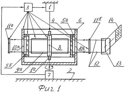 Лазер работает следующим образом. От блока питания 1 на излучатели 1а и 1б, установленные внутри активной среды 4, подают электропитание. Излучение накачки зеркалами 9 (а, б) концентрируется в секторах активной среды 4, расположенных напротив выходных окон 10 (а, б) и зеркал резонатора 11 (а, б). Средство вращения 7, установленное на неподвижном основании 2, приводит во вращение корпус 6 с осью вращения 8. Активная среда 4 установлена в корпусе 6 через подшипники 5 (а, б), что обеспечивает перемещение активной среды 4 из зоны генерации в теневую от засветки зону, где происходит ее охлаждение с помощью устройства 3. Излучение генерации 12 проходит через окно 10а, отражается от зеркала 11а и выходит через окно 10б и зеркало 11б по направлению объекта воздействия 13 с апертурой 14. При необходимости зеркало 11a может быть также выходным.