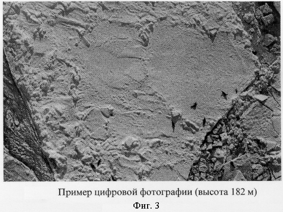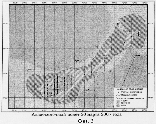 Определение размерно-возрастного состава гренландских тюленей проводилось по материалам учетной авиасъемки на щенных (март 2003 г.) и линных (апрель 2003 г.) залежках в Белом море (фиг.1, 2). На самолете-лаборатории АН-26 «Арктика» была установлена цифровая фотокамера NIKON D1X/ фотосъемка проводилась с высоты 150-200 м с двумя вариантами фокусного расстояния объектива – 28 и 80 мм. Фотографии получали с максимальным разрешением 3008×1950 пикселей, с динамическим диапазоном цвета – 48 бит.