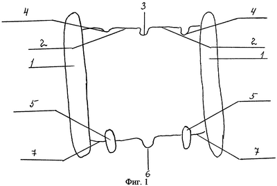 Щитовой аппарат состоит из двух вестибулярных щитов 1, с шаблонным пространством, которое больше высоты брекетов на 0,5 мм. Вестибулярные щиты 1 соединяются между собой изогнутой небной дугой 2, проходящей в области первых постоянных моляров верхней челюсти. Небная дуга 2 имеет -образный изгиб 3 по средней линии и два боковых изгиба 4, имеющих физиологическую форму боковых сегментов верхнего зубного ряда, плотно прилегающих к последним. Аппарат имеет два лингвальных щита 5, плотно прилегающих к язычным поверхностям боковой группы зубов нижней челюсти. Лингвальные щиты 5 соединены между собой -образной петлей 6, а с вестибулярными щитами 1 – отростками 7, проходящими в области первых постоянных моляров нижней челюсти. Аппарат изготовлен из стандартного материала, используемого для изготовления ортодонтически аппаратов и зубных протезов, например ортодонтическая нержавеющая проволока диаметром 0,9-1,1 мм для дуговых элементов, диаметром 0,6-0,8 мм для механически действующих элементов, для щитов – быстротвердеющая пластмасса.