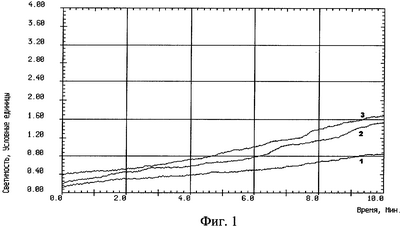 На фиг.2 изображен график записи индуцированной хемилюминесценции крови, взятой из внутренней яремной вены без защиты головного мозга: 1 – до реконструкции на сонных артериях, 2 – на высоте окклюзии сонных артерий, 3 – через 10 минут после снятия окклюзии сонных артерий.