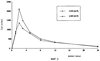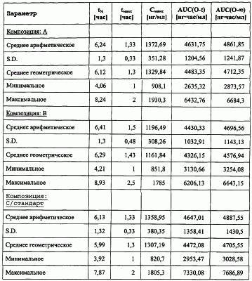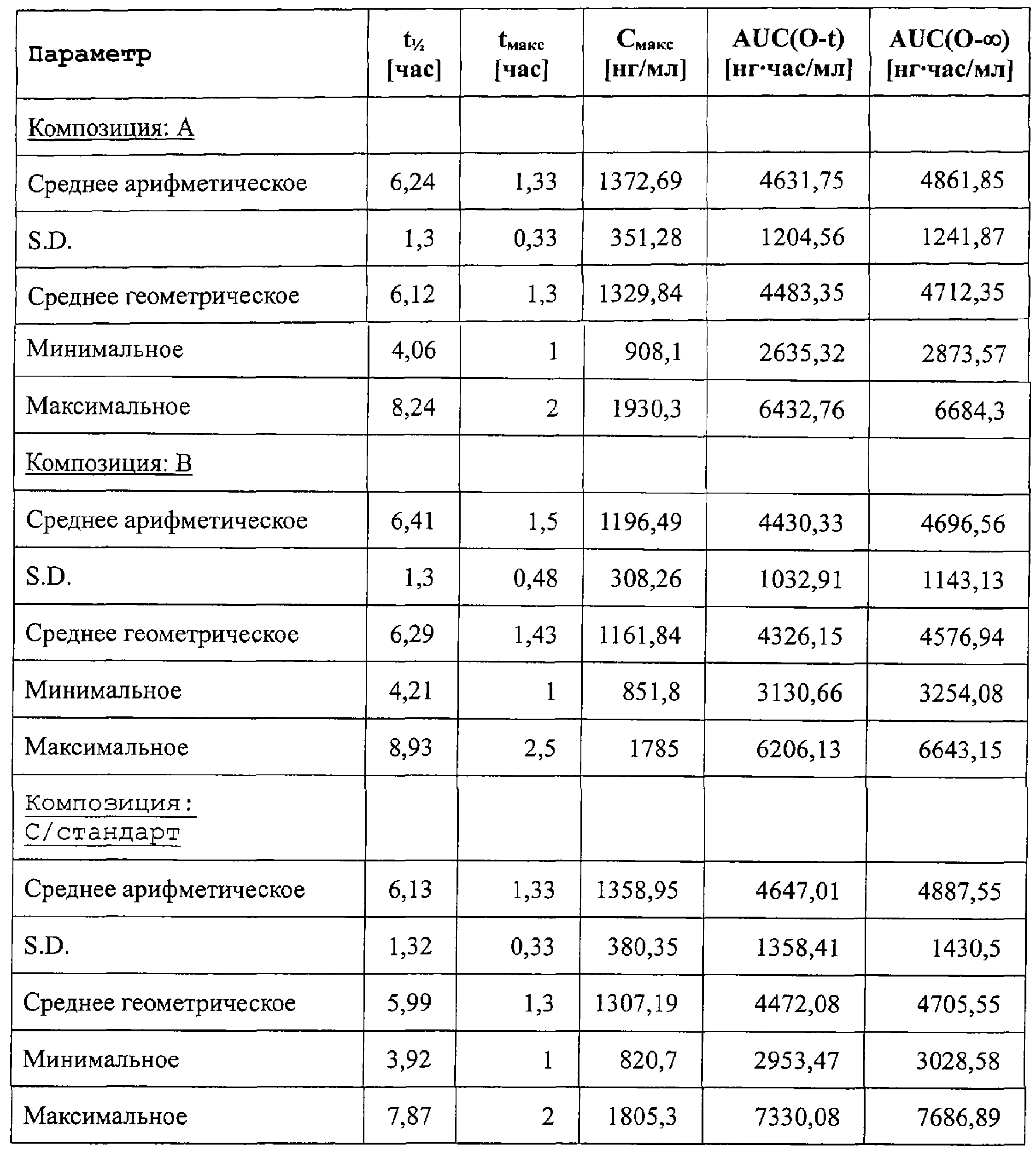 Cмакс. и tмакс были получены непосредственно из установленных данных концентрация/время. Константу скорости элиминации (kel) рассчитывали посредством логарифмического линейного регрессионного анализа наименьших квадратов терминальной части кривой концентрация в плазме-время. Площадь под кривой концентрация-время (AUCO-t) рассчитывали вплоть до последней измеримой точки концентрация-время (t) по правилу линейной трапеции. Экстраполяцию к бесконечности (AUCO-t, AUCO- ) производили делением последней определенной концентрации на константу скорости элиминации.