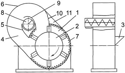 Измельчаемый материал в дробильную камеру 1 подается через входную горловину 3. Молотки ротора 2 измельчают материал и выбрасывают его в обводной канал 4. При этом мелкая фракция проходит по внутренней стенке 5 и выводится выгрузным приспособлением, например шнеком 8, находящимся в центре обводного канала 4. Более крупные частицы по инерции возвращаются в дробильную камеру 1 по внешней стенке 6 обводного канала 4 на доизмельчение. Проходя по дополнительной перфорированной стенке 10 обводного канала 4, крупные частицы измельчаемого материала отделяются от пыли, которая удаляется посредством камеры для отвода запыленного воздуха 11.