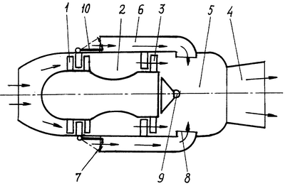 Согласно изобретению выходная камера сгорания размещена непосредственно за газовой турбиной перед реактивным соплом. Выходное отверстие воздуховода выполнено с возможностью направления потоков воздуха от периферии к центру выходной камеры сгорания, столкновения и взаимного торможения этих потоков в центральной части выходной камеры сгорания, обеспечивающих превращение их кинетической энергии в дополнительное сжатие. Перед входным отверстием входного устройства установлены управляемые заслонки, обеспечивающие возможность открытия или закрытия входного отверстия для встречного потока воздуха.