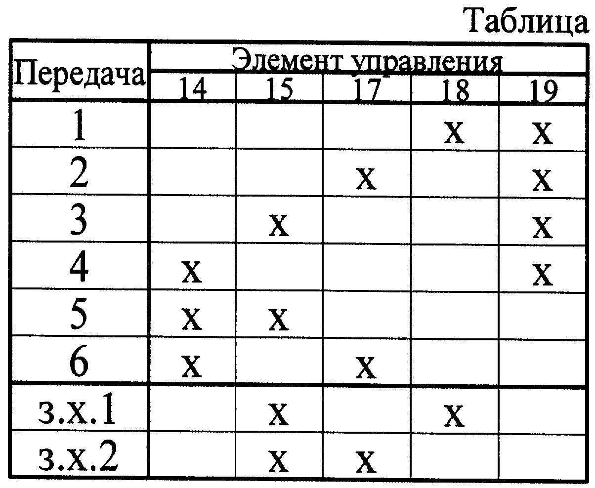 Для получения первой передачи должны быть включены тормоза 18 и 19 (см. таблицу). Крутящий момент от входного вала 2 (см. чертеж) и солнечной шестерни 3 через сателлиты планетарного механизма 4 передается на водило 13 и эпицикл 12. Далее крутящий момент через сателлиты планетарного механизма 10 передается на водило 9 и выходной вал 11.