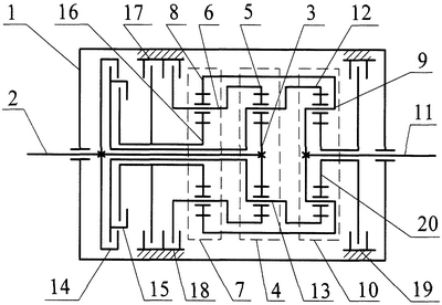 В опорах корпуса 1 расположен входной вал 2, с которым жестко связана солнечная шестерня 3 второго планетарного механизма 4. Эпицикл 5 планетарного механизма 4 связан с водилом 6 первого планетарного механизма 7, эпицикл 8 которого соединен с водилом 9 третьего планетарного механизма 10 и выходным валом 11. При этом эпицикл 12 третьего механизма 10 связан с водилом 13 второго планетарного механизма. Сцепная муфта 14 соединяет входной вал 2 с водилом 13. Сцепная муфта 15 соединяет водило 13 второго планетарного механизма 4 с солнечной шестерней 16 первого планетарного механизма 7. Тормоз 17 останавливает солнечную шестерню 16, тормоз 18 – водило 6 планетарного механизма 7, тормоз 19 – солнечную шестерню 20 третьего планетарного механизма 10.
