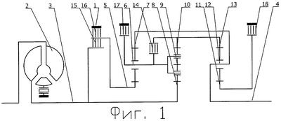 Крутящий момент с входного звена 3 разделяется и через включенную фрикционную муфту 15 передается на солнечную шестерню 5 первого планетарного ряда и далее на водило 6 первого планетарного ряда, а также через солнечную шестерню 8 второго планетарного ряда и водило 9 второго планетарного ряда передается на коронную шестерню 10 второго планетарного ряда и связанную с ней коронную шестерню 13 третьего планетарного ряда и далее на водило 12 третьего планетарного ряда, где разделяется и передается на связанное с водилом 12 третьего планетарного ряда выходное звено 4, а также на коронную шестерню 7 первого планетарного ряда, а с нее на водило 6 первого планетарного ряда, где объединяется с потоком крутящего момента от включенной фрикционной муфты 15 и затем передается на водило 9 второго планетарного ряда, на котором соединяется с крутящим моментом входного звена 3.