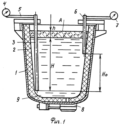 По мере разливки жидкого металла величина Н уменьшается. Здесь Н0 – известное расстояние между торцевыми поверхностями камер 3 и 6. После опускания мениска шлака – поверхность А, фиг.1, до уровня торца камеры 6, в ней фиксируется манометром 7 давление, равное атмосферному, когда избыточное давление равно нулю, Р2=0. В этот момент времени = 0 известно, что Н( 0)+h=Н0 и, следовательно, высота слоя шлака h=Н0-Н( 0). В камере 3 в этот момент фиксируется давление