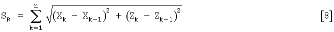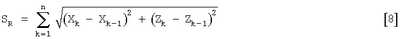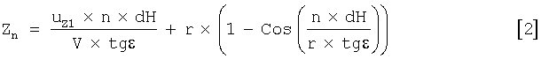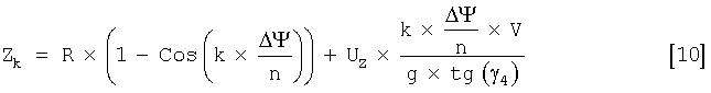 Проводя отрезки прямых линий между точками (Х0, Z0) и (Х1, Z1), (X2, Z2) и (X3, Z3)… одним цветом, а между точками (Х1, Z1) и (Х2, Z2), (Х3, Z3) и (Х4, Z4)… другим цветом (один из цветов может быть цветом фона), получают пунктирную линию прогнозируемой траектории полета, выполненную в виде масштабных меток высоты и дальности. Цена деления каждой черточки при этом равна шагу интегрирования dH=10 м и соответствует расстоянию . Проводя отрезки прямых линий перпендикулярно прогнозируемой траектории полета в точках (X10, Z10), (X20, Z20), …, (через каждую десятую точку) получают поперечные черточки, пропорциональные сотням метров высоты полета.