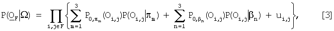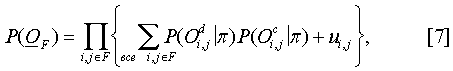 Выделение туловища – Любой пиксель, отнесенный к переднему плану, либо порождается либо плоскостью туловища, либо классом оставшихся данных, имеющих равномерное распределение. Предполагая, что все наблюдения являются независимыми случайными величинами, вероятность векторов наблюдения Оi,j при заданной модели переднего плана изображения F представляется следующим образом: