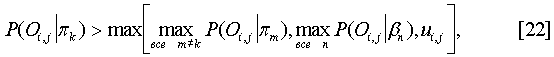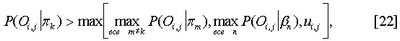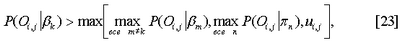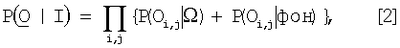 В равенстве [5] вероятность Р(Oc i,j| ) может быть плотностью нормального распределения или смеси плотностей нормальных распределений, описывающих распределение цвета пикселей плоскости. В соответствии с одной реализацией, для упрощения, используется равномерное распределение на множестве значений цветов (например, 0,…255 для 256 цветов). Вероятность векторов наблюдений Оd i,j при заданном плоскостном компоненте можно вычислить следующим образом: