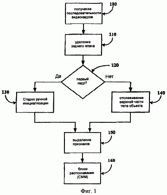 В традиционных системах распознавания жестов процесс может протекать так, как показано на фиг.1. В блоке 100 последовательность видеокадров получается из некоторого видеоисточника, такого как обычная видеокамера. В процессе удаления заднего плана, блок 110, из последовательности видеокадров устраняется фон, который представляет собой любую часть изображения, не содержащую жестикулирующего человека, жесты которого необходимо интерпретировать. Если видеокадр является первым кадром в последовательности видеокадров, блок 120, то работа процесса переходит к этапу ручной инициализации, блок 130. При ручной инициализации, блок 120, определяется позиция и ориентация видимых частей (обычно, головы, кистей, рук и туловища) человека. Традиционные системы, как правило, используют процессы ручной инициализации, в которых, например, процесс может быть инициализирован следующим образом: человека просят начать жестикулировать с некоторого заранее заданного положения его или ее рук или кистей. В других системах система может настраиваться на объект следующим образом: на кисти объекта надевают цветные перчатки или делают цветные пометки на кистях и голове объекта.