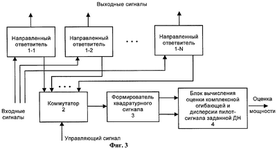 N направленных ответвителей 1-1 – 1-N передают часть поступающего входного сигнала на свой первый выход, а сигналы со второго выхода направленных ответвителей 1-1 – 1-N поступают на коммутатор 2. С выхода коммутатора 2, переключаемого с помощью управляющего сигнала, эти сигналы поочередно поступают в формирователь 3 квадратурного сигнала, выполненного, например, в виде квадратурного демодулятора или квадратурного гетеродина. В случае, если сигналы с первого выхода направленных ответвителей 1-1 – 1-N поступают на элементы антенной решетки, то, зная диаграмму направленности каждого элемента в отдельности, конфигурацию антенной решетки (линейная, циклическая и т.д.), а также относительные квадратурные сигналы, полученные с помощью данного устройства, можно определить диаграмму направленности такой антенной решетки. Сформированный квадратурный сигнал с выхода формирователя 3 квадратурного сигнала поступает на соответствующие входы блока 4 вычисления оценок комплексной огибающей и дисперсии пилот-сигнала заданной диаграммы направленности.