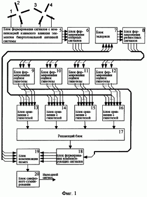 Работа устройства, функционирующего по предложенному способу, может быть проиллюстрирована с помощью фиг.1. Смесь полезного сигнала и помехи принимается независимо плечами 1 и 2, 3 и 4 вибраторов, входящих соответственно в первую и вторую биортогональные антенные системы, взаимно развернутые на угол 45°. Выходные сигналы вибраторов и , и поступают в блок 5 формирования сигналов с компенсацией взаимного влияния элементов биортогональной антенной системы, в котором на основании известной матрицы взаимных сопротивлений в соответствии с выражениями (5)-(8) формируются сигналы и , и с компенсацией взаимного влияния элементов биортогональной антенной системы. В этом же блоке 5 производится и преобразование частоты принятых сигналов. Учитывая, что для этого преобразования может использоваться набор стандартных элементов, данное преобразование не рассматривается. Сигналы поступают на вход блока 6 формирования опорных сигналов, где в зависимости от заданного направления прихода , полезных сигналов осуществляется их преобразование в соответствии с выражениями (9)-(12) в четыре опорных сигнала u 1 и u 1, u 2 и u 2. Полученные сигналы поступают на вход блока 7 задержек, где осуществляется выравнивание во времени отсчетов опорных сигналов в течение времени через где Т – период несущего колебания (полезного сигнала). В результате на выходе блока 7 задержек формируется девять отсчетов опорных сигналов (см. выражения (17)-(19)). Из пар отсчетов сигналов, амплитуды которых равны при отсутствии помех, в соответствии с выражениями (20)-(28) в блоке 8 формирования разностных сигналов формируются десять разностных сигналов i(i=1, 2,…, 10), которые поступают на вход блоков 9-12 формирования оценок гипотез. В каждом блоке формирования оценки гипотезы осуществляется определение гипотетических отсчетов помехового сигнала n(t) (см. выражения (29)-(40)) и составляется десять гипотетических разностных сигналов . Гипотетические разностные сигналы поступают на входы соответствующих блоков 13-16 сравнения с гипотезой. В каждом блоке 13-16 сравнения с гипотезой осуществляется вычисление невязок между гипотетическими и реальными разностными сигналами на основании выражений (41), (42). Полученные четыре сигнала невязки с выходов блоков 13-16 сравнения с гипотезой поступают на соответствующие входы решающего блока 17. В решающем блоке 17 выбирается сигнал невязки с наименьшей амплитудой. На выходе решающего блока формируется параллельный код, однозначно определяющий выбранную гипотезу, т.е. значение в выражениях (20)-(28). Полученный код поступает на вход блока 18 формирования компенсирующих сигналов. С выходов блоков 9-12 формирования оценок гипотезы на второй вход блока 18 формирования компенсирующих сигналов поступают четыре сигнала, соответствующих значениям гипотетических отсчетов сигнала помехи n(t) для всех четырех гипотез. В блоке 18 формирования компенсирующих сигналов на основании параллельного кода, поступающего на первый вход, осуществляется выбор гипотетического отсчета сигнала помехи n(t), соответствующего выбранной в решающем блоке 17 гипотезе, и формируются четыре компенсирующих сигнала n(t)sin , n(t)cos , -n(t) и n(t) При этом тригонометрические множители при n(t) для выбранного значения представляют собой постоянные коэффициенты усиления, однозначно определяемые выбором гипотезы. П