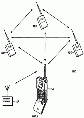 Фиг.1 изображает систему 100 радиосвязи с сотовым телефоном 110, имеющим одновременную передачу сигналов сотовой и радиосвязи, в соответствии с настоящим изобретением. Радиостанции 120 передают и принимают сигналы радиосвязи между друг другом и сотовым телефоном 110. Сотовый телефон 110 передает и принимает сигналы радиосвязи от радиостанций 120. Сотовый телефон 110 также передает и принимает сигнал сотовой связи от базовой станции 115. Система 100 радиосвязи может использовать портативные, мобильные и другие типы и комбинации сотовых телефонов и радиостанций. Система 100 радиосвязи может иметь множественные базовые станции, сотовые телефоны и больше радиостанций.