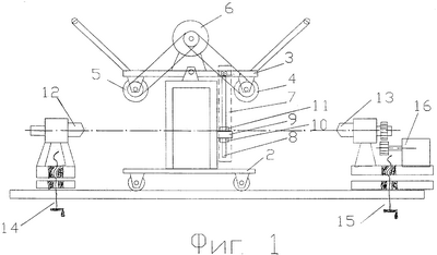 Обрабатываемое бревно закрепляют в центрах 12 и 13. С помощью механизмов 14 и 15 перемещения по вертикали верхнюю образующую поверхности бревна устанавливают параллельно направляющим 1 (Фиг.3). Поворотную платформу 3 поворачивают и фиксируют стопором 7 таким образом, чтобы фреза 4 обеспечивала срезание заданного припуска. Включают привод 16, бревно начинает вращаться, включают привод 6 и оператор надвигает каретку 2 на бревно. При перемещении каретки справа налево (Фиг.1) вдоль бревна оно обрабатывается в форме соответствующего форме исходного бревна. После обработки поверхности всего бревна приводы 6 и 16 выключают и каретку 2 возвращают в исходное состояние.