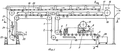 Далее люлька (2) с пустыми формами (3) после подъема в вертикальной секции (21) поступает в сушильную камеру (16) и перемещается по верхней (17) горизонтальной ветви и затем по правой части нижней (18) горизонтальной ветви. При этом происходит интенсивная сушка форм (3) при остановах вертикально-замкнутого конвейера (1), когда люлька (2) с формами (3) находится под соплами коробов (20). После этого люлька (2) с формами (3) опускается вниз в литейной секции (5) и выходит на ее верхний горизонтальный участок цепной трассы на позицию очистки форм (3). Далее начинается следующий рабочий цикл для данной люльки (3).