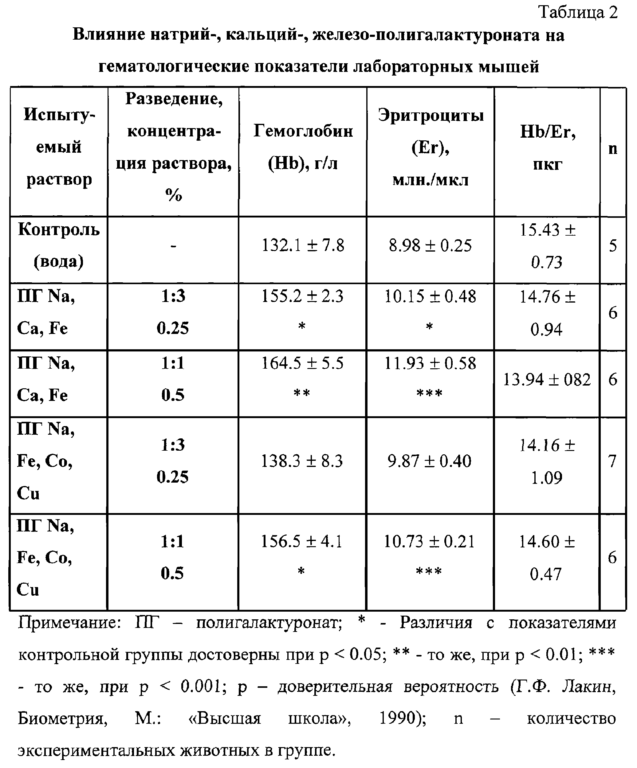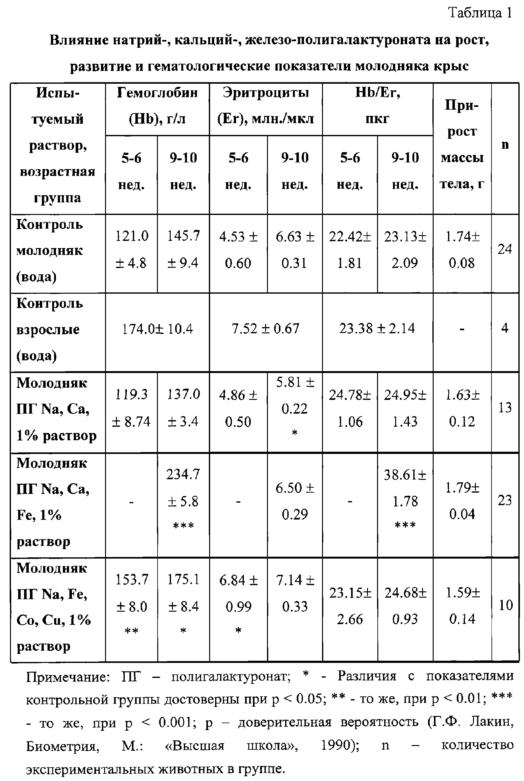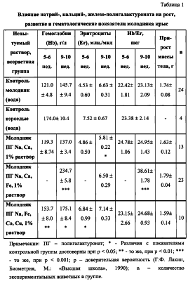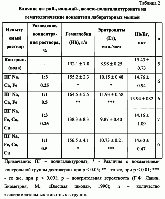 Описан водорастворимый натрий-, кальций-, железо-полигалактуронат общей формулы I используемый в качестве стимулятора процесса кроветворения. Соединение получают обработкой пектина раствором щелочи NaOH при 50-60°С с последовательным добавлением водных растворов солей кальция и железа и последующим осаждением спиртом, центрифугированием и сушкой. Соединение пригодно для использования как в твердом виде, так и в виде растворов для фармацевтических целей. 1 з.п. ф-лы, 2 табл.