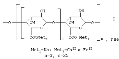 Изобретение относится к области высокомолекулярных природных соединений, а именно к новым полиметаллическим комплексам полигалактуроновой кислоты, обладающим ценными биологическими свойствами. Известны нерастворимые в воде пектинаты металлов, обладающие антимикробными свойствами (Авторское свидетельство СССР №1776656 А1, кл. С 08 В 37/06, 1992). Недостаток этих соединений – отсутствие растворимости в воде. Известны нерастворимые в воде комплексы ионов металлов с полигалактуроновой кислотой, обладающие биологическим действием на живой организм при оральном введении в твердом виде: повышают содержание железа в сыворотке крови (Патент СССР №886750, кл. С 08 В 37/06, 1981). Недостатком предложенных комплексов является также отсутствие растворимости в воде, что ограничивает возможности использования их в фармакологической практике. Наиболее близким по технической сущности и достигаемому результату к предлагаемому изобретению решением являются водорастворимые би- и полиметаллические комплексы полигалактуроновой кислоты с использованием трех металлов – микроэлементов Fe, Cu, Со, стимулирующие процесс кроветворения (Патент РФ №2219187, кл. С 08 В 37/06, А 61 Р 7/00, А 61 К 31/732, 2003). В настоящей заявке ставится задача получения нового комплекса полигалактуроновой кислоты, содержащего макроэлементы – Na, Ca и микроэлемент Fe, что расширит спектр биологически активных веществ, обладающих противоанемическими свойствами. Технический результат – получение нового соединения – водорастворимого натрий-, кальций-, железополигалактуроната, стимулирующего процесс кроветворения и пригодного для использования как в твердом виде, так и в виде растворов для фармацевтических целей. Поставленная задача решается новым водорастворимым полиметаллическим комплексом полигалактуроновой кислоты формулы I, обладающим противоанемическими свойствами. Соединения формулы I получают аналогично способу (Патент РФ №2220981, кл. А 61 К 31/732, 2004). На первом этапе обработкой пектина общей формулы II раствором щелочи NaOH при 50-60°С получают полигалактуронат Na. Далее последовательно добавляют водные растворы солей кальция и железа, и растворимые комплексы выделяют осаждением спиртом, центрифугированием и сушкой целевого продукта. Новые соединения общей формулы I могут быть использованы в фармацевтических целях для стимулирования кроветворной функции организма, как это иллюстрируется в примерах 3 и 4. Получение соединений общей формулы I осуществляется следующим образом: к раствору пектина в дистиллированной воде при перемешивании при 50-60°С прибавляют в течение 1.0-1.5 часа раствор едкого натра в воде с образованием полигалактуроната натрия, затем добавляют растворы солей двухвалентных металлов кальция и железа, и через 20 мин осаждают целевой комплекс этанолом, центрифугируют и сушат при 40-50°С. Представленные результаты получены при использовании цитрусового пектина марки “Classic C-401” производства фирмы “Herbstreith & Fox” (Германия) со средней молекулярной массой Мn 17600, определенной методом вискозиметрии. Степень полимеризации (g) пектата натрия и представленных в заявке пектатов двухвалентных металлов соответствует степени полимеризации исходного пектина и рассчитывается по формуле g=М Мг.к – молекулярная масса остатка галактуроновой кислоты (176). Молекулярная масса исходного пекти