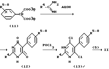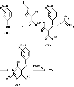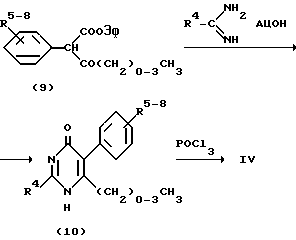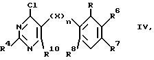 Нижеследующие примеры поясняют изобретение подробно. Применяемые в них сокращения означают следующее:т.к. – точка кипения, т.пл. – точка плавления, МС – масс-спектр и М – масса моля Пример 1 10,7 г 4-[4-хлоро-5-(2-хлоро-5-метокси-фенокси)-6-метил-пиримидин-2-ил]- морфолина и 21,6 г p-t-бутил-бензолсульфонамид-калия в 150 мл сухого диметилсульфоксида нагревали в среде аргона в течение 16 ч до 120oC. Затем диметилсульфоксид отгоняли, остаток распределяли между этилацетатом и 1н. соляной кислоты и органическую фазу вымывали нейтрализующим веществом. Органическую фазу сушили, раствор выпаривали и остаток перекристаллизовывали из дихлорметана/этанола. В результате получили 14,7 г 4-третбутил-N-[5-(2-хлоро-5-метокси-фенокси)-6-метил-2- (морфолин-4-ил)-пиримидин-4-ил]-бензолсульфонамида, т.пл. 154oC, МС:М=546. Исходный материал получали следующим образом: а) В раствор, содержащий 17,1 г 2-хлор-5-метоксифенола в толуоле, добавляли 2,8 г натрия. Реакционную смесь перемешивали при температуре 110oC в среде аргона в течение 3 часов, после чего обрабатывали раствором из 19,57 г сложного этилового эфира 2-хлор-ацетуксусной кислоты в толуоле. Реакционную смесь продолжали перемешивать еще в течение 3 часов при 110oC и распределяли между уксусной кислотой/водой 20% и толуолом. Органическую фазу сушили и раствор отгоняли. Остаток очищали над силикагелем дихлорметаном. В результате получили 18,2 г сложного этилового эфира (RS)-(2-хлоро-5-метокси-фенокси)-ацетуксусной кислоты в виде масла желтоватого цвета. МС:М=286. б) В раствор натрийметилата, содержащего 10 мл метанола и 0,19 г натрия, добавили 0,8 г морфолиноформамидингидробромида и 1 г сложного эфира (RS)-(2-хлоро-5-метокси-фенокси)ацетуксусной кислоты. Реакционную смесь перемешивали в течение 16 часов при температуре 80oC, установили на pH 6 и концентрировали. Остаток распределяли между хлороформом и водой. После сушки и выпаривания растворителя остаток кристаллизовали из этанола/дихлорметана. В результате были получены 0,45 г 5-(2-хлоро-5-метокси-фенокси)-6- метил-2-(морфолин-4-ил)-пиримидин-4-ола, т.пл. 252oC, МС:М=351. в) 1,72 г 5-(2-хлоро-5-метокси-фенокси)-6-метил-2-(морфолин-4-ил)- пиримидин-4-ола обрабатывали 3,3 мл POCl3. Реакционную смесь перемешивали при температуре 120oC в течение 2 часов, после чего избыточный реагент отгоняли. Остаток обрабатывали хлороформом и вымывали водой, 1н. NaOH. Органическую фазу сушили, концентрировали и остаток перекристаллизовывали из простого эфира. В результате были получены 1,48 г 4-[4-хлоро-5- (2-хлоро-5-метокси-фенокси)-6-метил-пиримидин-2-ил]-морфолина, т.пл. 134oC, МС:М=369. Пример 2 14,6 г 4-третбутил-N-[5-(2-хлоро-5-метокси-фенокси)-6-метил-2- (морфолин-4-ил)-пиримидин-4-ил]-бензолсульфонамида и 15,9 г двуокиси селения в 500 мл диоксана перемешивали в автоклаве при температуре 170oC в течение 6 часов. Реакционную смесь фильтровали и фильтрат концентрировали. Остаток распределяли между хлороформом и водой. Органическую фазу сушили, растворитель выпаривали и остаток перекристаллизовывали из дихлорметана/этанола. В результате были получены 10,3 г 4-третбутил-N-[5-(2-хлоро-5-метокси-фенокси) -6-формил-2-(морфолин-4-ил)-пиримидин-4-ил] -бензолсульфонамида, т.пл. 235-236oC, МС:М=561. Пример 3 7 г 4-третбутил-N-[5-(2-хлоро-5-метокси-фенокси)-6-формил-2- (морфолин-4-ил)-пиримидин-4-ил] -бензолсульфонамида в 300 мл этанола обрабатывали 0,9 г натрийборгидрида. Реакционную смесь перемешивали при температуре 80oC в т