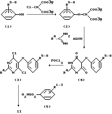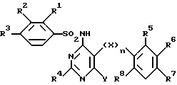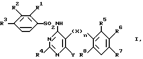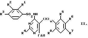 ![]() где R1 обозначает водород, низший алкил; R2 обозначает водород, низший алкил; R3 обозначает водород, низший алкил; R2 и R3 обозначают вместе метилендиокси, этилендиокси или изопропил идендиокси; R4 обозначает водород, низший алкил, низший алкоксил, низший алкилтио, окси-низший алкил, окси-низший алкокси, окси-низший алкокси-низший алкил, окси-низший алкокси-низший алкокси, алкокси-низший алкил, алкокси-низший алкилокси, амино-низший алкил, низший алкил-амино-низший алкил, морфолино, 2-пиримидинил, -CHO, -CH2OH или -CH2Cl; R5-R8 обозначают водород, галоген, низший алкокси, низший алкилтио; X обозначает -O- или -S-; Y обозначает -CHO, C1-4-алкил, -(CH2)1-4-Z-R9, -(CH2)0-3C(O)OR9, -(CH2)1-4-OC(O)(CH2)1-4CH3, -(CH2)1-4-OC(O)гет, -(CH2)1-4OCH2CH(OH)CH2OH и его циклические кетали, -(CH2)1-4NR9CH2CH(OH)CH2OH, -(CH2)1-4O(CH2)1-4-ZH, -(CH2)1-4NR9(CH2)1-4-ZH, -(CH2)1-4O(CH2)1-4-OC(O)гет, -(CH2)1-4гал, -OR12; R9 представляет собой водород или C1-4-алкил, R12 представляет собой C1-4-алкил или -(CH2)0-4-арил; Z обозначает -O-; гет – гетероциклический остаток, такой, как тиенил, фурил, пиридинил; гал – галоген; n обозначает 0 или 1. 2. Соединения по п.1, где Y представляет собой -OR12; R1-R9, R12, X, n имеют значения, указанные в п.1. 3. Соединения по п.1, где Y представляет собой -CHO, C1 – C4 алкил, -(CH2)1-4-Z-R9, -(CH2)1-4-OC(O)гет, -C(O)OR9, -(CH2)1-4-OC(O)(CH2)1-4CH3, -CH2OCH2CH(OH)CH2OH и его циклические кетали, -CH2NR9CH2CH(OH)CH2OH, -CH2O(CH2)1-4-ZH, -CH2NR9(CH2)1-4-ZH, -CH2O(CH2)1-4-OC(O)гет, -CH2гал; R1-R9, R11, гет, гал, X, Z, n имеют значения, указанные в п.1. 4. Соединения по пп.1 – 3, где n обозначает 1 и X обозначает 0. 5. Соединения по любому из пп.1 – 4, где R1 и R2 обозначают водород; R3 обозначает низший алкил. 6. Соединения по любому из пп.1 – 5, где R6 обозначает низший алкокси; R5 и R7 обозначают водород; R8 обозначает галоген. 7. Соединения по любому из пп.1 – 6, где R4 обозначает водород, 2-пиримидинил, морфолино. 8. Соединения по любому из пп.1 – 7, где Y обозначает -CHO, C1-4алкил, -(CH2)-Z-R9, -CH2O-CH2CH(OH)CH2OH и его циклические кетали; -CH2NR9CH2CH(OH)CH2OH, -CH2O(CH2)1-4-ZH, -CH2O(CH2)1-4-OC(O)гет, -CH2гал. 9. Соединения по п.2: 4-третбутил-N-[6-этокси-5-(2-метоксифенокси)-2,2′-бипиримидин-4-ил] -бензолсульфонамид и 4-третбутил-N-[6-метокси-5-(2-метоксифенокси)-2,2′-бипиримидин-4-ил] -бензолсульфонамид. 10. Соединения по п.3: 4-третбутил-N-[5-(2-хлоро-5-метокси-фенокси)-6-метил-2-(морфолин-4-ил)-пиримидин-4-ил]-бензолсульфонамид, 4-третбутил-N-[5-(2-хлоро-5-метокси-фенокси)-6-формил-2-(морфолин-4-ил)-пиримидин-4-ил]-бензолсульфонамид, 4-третбутил-N-[5-(2-хлоро-5-метокси-фенокси)-6-оксиметил-2-(морфолин-4-ил)-пиримидин-4-ил]-бензолсульфонамид, 4-третбутил-N-[5-(2-хлоро-5-метокси-фенокси)-6-хлорметил-2-(морфолин-4-ил)-пиримидин-4-ил]-бензолсульфонамид, 4-третбутил-N-[5-(2-хлоро-5-метокси-фенокси)-6-(2-оксиэтоксиметил)-2-(морфолин-4-ил)-пиримидин-4-ил]-бензолсульфонамид, 4-третбутил-N-[5-(2-хлоро-5-метокси-фенокси)-6-метил-пиримидин-4-ил]-бензолсульфонамид, 4-третбутил-N-[5-(2-хлоро-5-метокси-фенокси)-6-формил-пиримидин-4-ил] -бензолсульфонамид, 4-третбутил-N-[5-(2-хлоро-5-метокси-фенокси)-6-окси-метил-пиримидин-4-ил]-бензолсульфонамид, 4-третбутил-N-[5-(2-хлорометил-5-(2-хлоро-5-метокси-фенокси)-пиримидин-4-ил]-бензолсульфонамид, 4-третбутил-N-[5-(2-хлоро-5-метокси-фенокси)-6-(2-окси-этоксиметил)-пиримидин-4-ил]-бензолсульфонамид, сложный 2-[6-(4-третбутил-фенилсульфонамино)-5-(2-хлоро-5-метокси-фенокси)-2-(морфолин-4-ил)-пиримидин-4-ил-метокси]-этиловый эфир тиофен-3-карбоновой кислоты, (RS)-4-третбутил-N-[5-(2-хлоро-5-метокси-фенокси)-6-(2,2-диметил-1,3-диоксолан-4-илметоксиметил)-2-морфолин-4-ил)-пиримидин-4-ил] -бензолсульфонамид, (RS)-4-третбутил-N-[5-(2-хлоро-5-метокси-фен