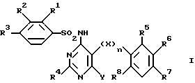 (57) Реферат: Описываются новые сульфонамиды общей формулы I, где R1 обозначает водород, низший алкил; R2 обозначает водород, низший алкил; R3 обозначает водород, низший алкил; R2 и R3 обозначают вместе метилендиокси, этилендиокси или изопропилидендиокси; R4 обозначает водород, низший алкил, низший алкоксил, низший алкилтио, окси-низший алкил, окси-низший алкокси, окси-низший алкокси-низший алкил, окси-низший алкокси-низший алкокси, алкокси-низший алкил, алкокси-низший алкилокси, амино-низший алкил, низший алкиламино-низший алкил, морфолино, 2-пиримидинил, -СНО, -СН2ОН или -CН2Cl; R5-R8 обозначают водород, галоген, низший алкокси, низший алкилтио; Х обозначает -О- или -S-; Y обозначает -СНО, С1-4-алкил, -(CH2)1-4-Z-R9, -(СН2)0-3С(O)ОR9, -(CH2)1-4-OC(O) (СН2)1-4СН3, -(СН2)1-4OС(O)гет, -(СН2)1-4OСН2СН(ОН)СН2OН и его циклические кетали, -(CH2)1-4NR9CH2CH(OH)CH2OH, -(CH2)1-4O(CH2)1-4-ZH, -(CH2)1-4NR9(CH2)1-4ZH, -(СН2)1-4O(СН2)1-4OС(O)гет, -(СН2)1-4гал, -OR12, R9 представляет собой водород или С1-4-алкил; R12 представляет собой C1-4-алкил или -(СН2)0-4-арил; Z обозначает -О-, гет-гетероциклический остаток, такой, как тиенил, фурил, пиридинил, гал-галоген, и n обозначает 0 или 1. Соединения представляют собой ингибиторы эндотолиальных рецепторов и могут применяться для лечения заболеваний, связанных с процессами, способствующими сужению сосудов. 12 з.п. ф-лы, 2 табл.