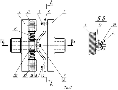 При уменьшении передающего момента пружины 15 и 18 начнут возвращать ползуны 9 и 10 в противоположном направлении до уравновешивания моментов на полумуфтах 1 и 2.