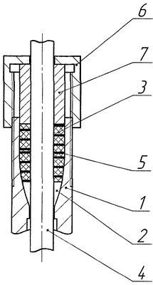 Однако гарантированное обжатие штока может произойти по длине только одного витка спирали. В упомянутом аналоге спираль изготовлена набором из материалов с разной твердостью, начиная от металла и заканчивая сальниковой набивкой. В этой конструкции можно на какое-то время достичь распределения контактного давления по большему числу витков (контактное давление между штоком и спиралью, между витками спирали, между спиралью и стенкой камеры, которое и определяет герметичность конструкции). Тем не менее, при работе происходит вынос, прежде всего, сальниковой набивки. Витки из металла в этом случае “зависают” в конической камере, расклинивая стенку камеры и шток, т.е. контактное давление между витками из металла и сальниковой набивки падает и становится возможной протечка уплотняемой среды по винтовой линии расположения сальниковой набивки.