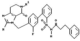 (57) Реферат: Изобретение относится к новым производным имидазопиридинов формулы I ![]() где R означает группу формулы Ia ![]() R1 означает F, R2-SO2NHCOR5, R3 – A, R4 – группа формулы CnH2nR9; R5 – A, – CtH2t(С3-С8циклоалкил), – CtH2t-Ar; R9-COOA, Ar-СО-NR6R7, -СО-Ar; R6 и R7 соответственно Н, А, ArCnH2n или R6 и R7 вместе означают алкиленовую цепочку с С-5, R8 означает С1-С6-алкил, А – С1-С6-алкил, Аr – незамещенная группа фенила, t-0, 1, 2 или 3, n=1, 2, 3, 4 или 5 или их солям, а также к способу их получения, фармацевтической композиции на их основе и способу получения композиции. Указанные соединения и фармацевтическая композиция обладают антагонистическим действием по отношению к ангиотензину II и могут быть использованы для лечения гипертензии, альдостеронизма, сердечной недостаточности, нарушений центральной нервной системы и других заболеваний. 4 с. и 2 з.п. ф-лы, 1 табл. Изобретение касается новых производных имидазопиридинов формулы I ![]() где R означает: ![]() R1 означает F, Cl, Br, A или CF3, R2 – SO2NH-COR5, R3 – A, C2-C6-алкенил, C2-C6-алкинил, C3-C8-циклоалкил – CkH2k- или C2-C6-алкил, где группа CH2 замещена “О или “S”, R4 – H, Rb, незамещенный или однократно или многократно замещенный COOH, COOA, CN, NO2, NR6R7, NHCOR8, NHSO2R8, Hal и/или Ar C2-C6-алкенил, C2-C6-алкинил, -CnH2n-R9 или -CHR10-CkH2k-R11, R5 – A, – CtH2t-(C3-C8-циклоалкил), -CtH2t -Ar, -OA, -O-CtH2t- -(C3-C8-циклоалкил), -O-CtН2t-Ar, -CpН2p-O-C3-C8-циклоалкил или – CpH2p-O-Ar, R6 и R7- смотря по обстоятельствам H, A, C2-C6-алкенил или C2-C6-алкинил, Ar, ArCnH2n – или Het 2, R6 – также – CH2COOA, – SO2-A или -SO2-Ar, R6 и R7 означают вместе также алкиленовую цепочку с 2-5 атомами C, которая может быть однократно или многократно замещена карбонильным кислородом, Ar, Het2, -CO-Ar, -COOA, -CO- -N(A)2, -CH2OH, -SO2-Ar и/или -NH-CO-A- и/или может быть прервана радикалами О или -NR16-, R8 означает C1-C5-алкил, где также один или несколько атомов H могут быть замещены F, R9 – C3-C8-циклоалкил, CN, COOA, COOH, Ar, Het1, Het2, 1H-5-тетразолил, -CO-NR6R7, -CO-R8, -CO-Ar, -CO-Неt2, -CO-R14, -C(=NR12)-A, -C(=NR12)-Het2, -S(O)m-A, -S(O)m-Ar, -S(O)m-Het2, -SO2-NH-Het2 или -SO2-OR15, R10 – COOH, COOA, CONR6R7, CN, NO2, NHCOR11, NHSO2R11 или IP-5-тетразолил, R11 – Ar или циклоалкил с 3-8 атомами C, R12 – H, OH, CN, R13, OR13 или OAr, R13 – A, алкенил C2-C6 или алкинил C2-C6-, R14 – NH-CHR15-COOH, -NH-CHR15-COOA, -CH2S(O)m-Ar, -CH2-COOA, -CnH2N-NO2, -CnH2n-NR6R7 или – CnН2n-NHCOOA, R15 – H или A, R16 – H, A, Ar, COOA, Het2 или SO2-Ar, A – C1-С6-алкил, Ar – незамещенная или моно или дизамещенная R8, OH, OR11, COOH, COOA, CONH2, CONHA, CON(A)2, CH2OH, CH2OA, CN NO2, NH2, NHA, N(A)2, NHCOR11, NHCOOA, NHSO2R8, Hal и/или IP-5-тетразолилом фенильная группа, Het1 – пяти- или шестичленный насыщенный гетероциклический остаток с 1-3 атомами N, О и/или S, который может быть просто замещен карбонильным кислородом или =NR12 , и/или N-атом (атомы) его кольца может (могут) быть замещен (замещены) соответственно A или Ar, Het2 – пяти- или шестичленный гетероароматический остаток с 1-3 атомами N, О и/или S, который может быть конденсирован также бензольным или пиридиновым кольцом, Hal – F, C1, Br или I, K и t – соответственно 0, 1, 2, 3 или 4, m – 0, 1 или 2, n – 1, 2, 3, 4, 5 или 6 и P – 1 или 2, а также их солей. Аналогичные соединения известны из Европейского патента EP-A2-0400 974. В основу изобретения положена задача открыть новые соединения с ценными свойствами, в частности такие, которые могут применяться для получения лекарственных средств. Было обнаружено, что соединения формулы I и их соли при хорошей совместимости обладают очень ценными фармакологическими свойствами. В частности, они обнаруживают антагонистические свойства по отношению к ангиотензину II и могут поэтому использоваться в качестве активных компонентов лекарственных средст