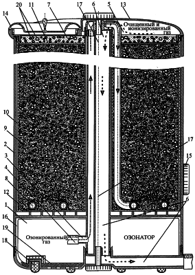 Рассмотрим осуществление предлагаемого способа с помощью устройства, изображенного на чертеже. Озонатор 1 через воздушный фильтр 19 забирает воздух, озонирует и продавливает его через пористые стенки барботера 8 и совмещенные слои воды 7 и частиц сорбента 9. При этом озонированный газ 20 очищается от токсичных компонентов и обогащается отрицательными ионами, в том числе и ионами озона. Далее очищенный и обогащенный ионами озонированный газ 20 по каналу отвода 6 выводится из контактной емкости 2 и вводится в объем воздуха жилого помещения в заданной области данного объема. Месторасположение данной области и количество вводимого газа определяются из условия, при котором содержание озона во вдыхаемом воздухе не превышает нормы.
