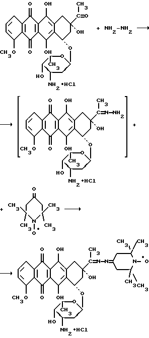 ![]() из гидрохлорида рубомицина, включающий обработку гидрохлорида рубомицина гидразин-гидратом или безводным гидразином при их молярном соотношении 1 : (1,1 – 1,2) соответственно в среде метанол-хлороформ или этанол-хлороформ, взятых в объемных соотношениях 2 : 1 соответственно, в присутствии уксусной кислоты при температуре 20 – 40oC с последующим взаимодействием полученного гидразона рубомицина гидрохлорида с 2,2,6,6-тетраметил-4-оксопиперидин-1-оксилом и выделением продукта путем неполной вакуумной отгонки растворителей с последующим переосаждением эфиром, отличающийся тем, что синтез проводится с использованием уксусной кислоты в количестве 0,2 – 1% от массы гидрохлорида рубомицина при молярном соотношении гидразона рубомицина гидрохлорида и 2,2,6,6-тетраметил-4-оксопиперидин-1-оксила 1 : (1,9 – 2,0) с последующей нейтрализацией посредством добавления нейтрализующего агента до получения значения рН реакционной смеси 6,8 – 7,2 перед вакуумной отгонкой растворителей и доведением объема реакционной смеси до 1/5 от первоначального. 2. Способ по п.1, отличающийся тем, что в качестве нейтрализующих агентов перед вакуумной отгонкой растворителей используют этанольный (метанольный) раствор гидроксида натрия (калия), или метанольный (этанольный) раствор натриевой (калиевой) соли органической кислоты, или метанольный (этанольный) раствор натриевой (калиевой) соли аминокислоты. РИСУНКИ