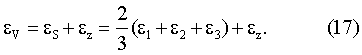 Для определения объемной деформации среды, в которую установлен МСД (массив горных пород, тело плотины, стена сооружения и т.п.), необходимо еще знать величину относительной линейной деформации в направлении оси цилиндра z= z/R, которая определяется измерителем осевых деформаций. Здесь z – измеряемые ЕПП осевые перемещения, R – радиус полусферы (база измерителя осевых деформаций). В нашем случае, когда поперечная жесткость боковых стенок цилиндра и продольная (вдоль оси) жесткость полусферы подобраны равными жесткости вмещающей среды, для малых объемных деформаций среды можно написать