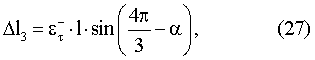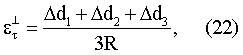 Как было сказано выше, составляющие сдвиговых деформаций в направлениях, перпендикулярных обкладкам ЕПП, могут быть измерены с помощью тех же ЕПП, работающих в режиме изменяемого зазора (ИЗ) между обкладками. Обозначим через d1, d2 и d3 измеряемые в этом режиме каждым преобразователем 1, 2, и 3 (Фиг.5) перемещения в направлении, перпендикулярном плоскостям обкладок. Как нетрудно установить из этого рисунка, аналитически они могут быть выражены соотношениями