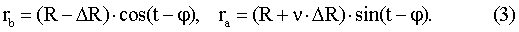Обозначим ЕПП цифрами 1, 2, 3 и совместим роторную обкладку первой из них с положительным направлением оси Х. Введем, далее, следующие обозначения: R – внутренний радиус недеформированного цилиндра (показан штриховой линией), R – максимальное изменение радиуса цилиндра при деформации, а – большая и b – малая полуоси горизонтального сечения деформированного цилиндра, которого мы принимаем за эллипс, r – текущий радиус-вектор эллипса в системе координат с началом в центре эллипса, t – текущий азимут радиус-вектора.