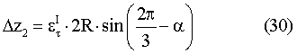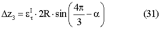 Как очевидно из фиг.7, измеряемые первым ТИД вертикальные составляющие смещений z1, z2, z3, вызванные вертикальной компонентой сдвиговых деформаций , пропорциональны разносам точек крепления роторных и статорных обкладок каждого ЕПП в направлении, перпендикулярном азимуту простирания плоскости максимальных сдвиговых деформаций. Они равны соответственно 2 1=2R·sin , 2 2=2R·sin(2 /3- ), 2 3=2R·sin(4 /3- ), и для смещений имеют место соотношения