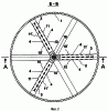 Сечение деформографа по Б-Б (Фиг.2) показывает взаимное расположение и ориентацию трех пар статорных обкладок и сопряженных с ними роторных обкладок второго ТИД. Волнистыми линиями показаны электровыводы, идущие от пакетов 10-10′ и 11-11′ к кабелю 16 и далее к платам емкостных преобразователей (Фиг.1). Сечение по В-В (Фиг.3) показывает конфигурацию обкладок ЕПП третьего ТИД, которая имеет аналогичный вид. Полоски как роторных, так и статорных обкладок ЕПП в измерителе осевых деформаций и в первом ТИД направлены радиально, а во втором и третьем – вдоль оси цилиндра.