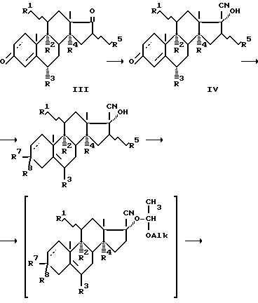 Технический результат достигается тем, что в способе получения кортикостероидов общей формулы I![]() где R1– – или – OH-группа или атом H,R2 – H или ОН, или F, или вместо R1, R2 – двойная связь, R3 – H, или F, или CH3-группа, R4 -H или OH-группа, R5 – – или – CH3-группа или атом H,R6 – H или Ac, заключающемся в том, что прегнаны общей формулы II ![]() где R7 и R8 вместе кетогруппа или незамещенный, 2-монозамещенный или 2,2-дизамещенный пропиленкефаль, подвергают галоидированию С-21 положения с последующим замещением галоида на гидрокси- или ацетокси-группу, для получения прегнанов в качестве исходного соединения используют 3,17 – дикетоандростаны общей формулы III ![]() которые подвергают цианированию, защите 17 -OH группы, защите 3-кетогруппы с помощью незамещенного, или 2-замещенного, или 2,2-дизамещенного пропиленкеталя и алкилированию 17-CN-группы с последующим гидролизом.