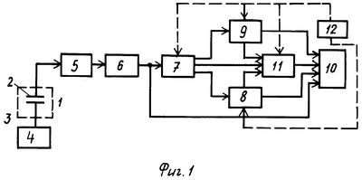 Устройство работает следующим образом. В поляризованном состоянии в режиме покоя датчика (без пульсаций давления) и в рабочем режиме (под воздействием давления) давление, преобразованное в электрический сигнал датчиком 1, несет информацию о полном сигнале, шумов и помех и полезном сигнале. Затем после согласования сигнала датчика в усилителе заряда 5 и нормирующем усилителе 6 сигнал через переключатель 7 поступает на вход блоков деления 8, умножения 9 и индикатор 10. В блоке памяти 11 по команде блока управления 12 запоминают выходное напряжение Uвых, коэффициент преобразования датчика, коэффициенты а, b,  , E, U, размеры обкладок а×b. В блоке деления 8 выходное напряжение Uвых усилителя 6 делится на коэффициент U, на эту величину следует умножать базовый сигнал Uвых23, полученный при начальной базовой температуре 23°С.