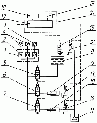 Источник сжатого воздуха 11, например заводская пневмосеть давлением 0,6 МПа, через редукционные клапаны 12, 13 и 14 пневмомагистралями соединен соответственно с баком 8 и пневмогидравлическими мультипликаторами 9 и 10. Между редукционным клапаном 12 и баком 8 установлен электроуправляемый вентиль 15, соединяющий бак в отсутствии электрического сигнала управления с атмосферой, а при подаче электрического сигнала управления – с источником сжатого воздуха 11. Редукционные клапаны 12, 13 и 14 могут быть ручного управления и электроуправляемые. На чертеже показан вариант электроуправляемых редукционных клапанов.