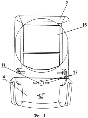 Цоколь 1 позволяет изготавливать счетчики с креплением печатных плат как на двух уровнях, так и на трех уровнях. Для этого в цоколе имеются две защелки 6 для крепления печатной платы с боков на верхнем уровне, а также несколько стоек 7 и 8 разной длины для крепления остальных плат на нижних уровнях посредством винтов самонарезающих. Крепление кожуха 2 к цоколю 1 в верхней части осуществляется посредством взаимодействия двух зацепов 9 в верхней части внутри кожуха с двумя внутренними выступами 10 в цоколе. Дополнительное крепление кожуха к цоколю осуществляется посредством двух боковых винтов, вставляемых в резьбовые отверстия 11, выполненные с малым углом наклона к оси симметрии отверстий (вертикальной оси). Выполнение крепежных резьбовых отверстий под наклоном позволяет осуществить точную и надежную стыковку зацепов 9 кожуха с внутренними выступами 10 цоколя. Колодка 3 крепится к цоколю посредством двух защелок 12, выполненных в нижней части боковых стенок цоколя 1. Для дополнительной фиксации колодки на приливах 5 цоколя выполнены цилиндрические выступы 13, которые при сборке входят внутрь пустотелых выступов 14 сзади колодки. Кроме того, для фиксации колодки и герметизации узлов счетчика в местах сопряжения колодки и цоколя выполнены паз и выступ соответственно.