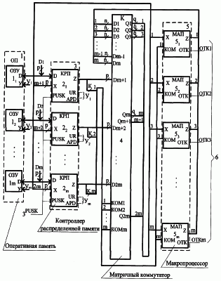 Информационные входы D1-Dm устройства соединены с двунаправленными входами/выходами оперативной памяти и двунаправленными входами/выходами D блока 2 мультиконтроллеров распределенной памяти, управляющие входы PUSK которых соединены с входом 3 управляющего сигнала PUSK устройства, первые информационные входы D1-Dm матричного коммутатора 4 соединены соответственно с первыми выходами Z блока 5 макропроцессоров, первые информационные входы Х которых соединены соответственно с первыми выходами Q1-Qm матричного коммутатора 4, вторые выходы Qm+1-Q2m которого соединены с информационными входами Х блока 2 мультиконтроллеров распределенной памяти, информационные выходы Z которых соединены с вторыми информационными входами Dm+1-D2m и третьими входами KOM1-KOMm матричного коммутатора 4 и вторыми входами КОМ блока 5 макропроцессоров, управляющие выходы Y1-Ym блока 2 мультиконтроллеров распределенной памяти соединены с управляющими входами оперативной памяти 1, вторые выходы OTK1-OTKm блока 5 макропроцессоров соединены с выходами 6 устройства.