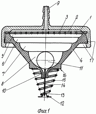 На фиг.1 представлен водовыпуск для капельного орошения, диаметральный разрез, мембрана и поплавок находятся в исходном, нерабочем положении.