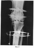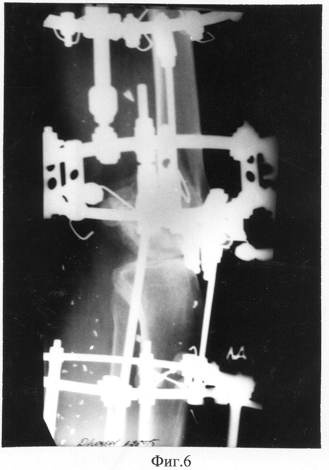 Под эпидуральной анестезией было наложено устройство для лечения посттравматического гонартроза из 5-ти опор, которые соединяли при помощи стержней и стержней с шарнирами. При этом опора, установленная в проекции мыщелков бедренной кости, не содержала спиц. Была произведена артротомия левого коленного сустава, выполнена остеотомия в проекции плоскости излома внутреннего мыщелка бедренной кости с переходом в проксимальном направлении на метадиафизарную часть внутреннего кортикала бедренной кости. Через сформированый фрагмент внутреннего мыщелка бедра по направлению от его проксимальной части к дистальной вдоль биомеханической оси конечности в сагиттальной плоскости были проведены две дистракционно-направляющие спицы с перекрестом 20°, которые при помощи резьбовых стержней с пазом и шарнирных узлов крепились к дистальной опоре на голени (Фиг.4). Посредством дистракции по стержням, установленным по внутренней поверхности коленного сустава между базовыми модулями аппарата на бедре и голени, выравнивалась щель коленного сустава с одновременным частичным низведением остеотомированного фрагмента внутреннего мыщелка бедренной кости. При помощи дистракционно-направляющих спиц, посредством дистракции по резьбовым стержням с пазом, осуществлялось низведение мыщелка до нормокоррекции. В процессе низведения мыщелка выполняли контрольную рентгенографию, после чего в кософронтальной плоскости через мыщелки бедренной кости были проведены четыре спицы со штопорообразными упорными площадками три – изнутри, а одна – снаружи, которые фиксировались к дистальной опоре на бедре в проекции его надмыщелков при помощи стержней с пазом и кронштейнов. Узлы продольного перемещения мыщелка были демонтированы, дистракционно-направляющие спицы удалены (Фиг.5, 6). Перемещение мыщелка по ширине в плоскости, перпендикулярной оси конечности, осуществляли при помощи спиц со штопорообразными упорными площадками, посредством дистракции по стержням с пазом до восстановления конфигурации мыщелков бедренной кости.