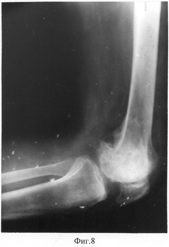 Фиг.8 – рентгенограмма коленного сустава пациента в боковой проекции с максимальным сгибанием через 1 год после снятия аппарата.