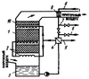 Установка утилизации тепла оборудования снабжена системой защиты от обмерзания 2 и имеет повышенную плотность орошения нижней ступени двухступенчатого контактного теплообменника 1 с компактной тонкопленочной гофрированной насадкой из винипластовой каландрированной пленки толщиной 0,4…0,8 мм, которая безопасна в обращении, трудновоспламеняема и при температуре до 170°С не выделяет вредных веществ. Отдельные отформованные листы насадки склеиваются клеем. Насадочная поверхность представляет собой чередующиеся каналы треугольной формы, которые наклонены к оси отекания теплоносителя по противоточной схеме: один лист под углом +30°, другой, наклеенный на него, -30°. По длине каналы выполнены с П-образным гофрированием (на чертеже не показано). Вода из системы охлаждения по трубопроводу 6 поступает в теплообменник 4, где отдает свою теплоту на нагрев воды, поступающей из поддона 3 в теплообменник 1 и систему защиты от обмерзания 2, и далее по трубопроводу 5 возвращается в систему охлаждения.