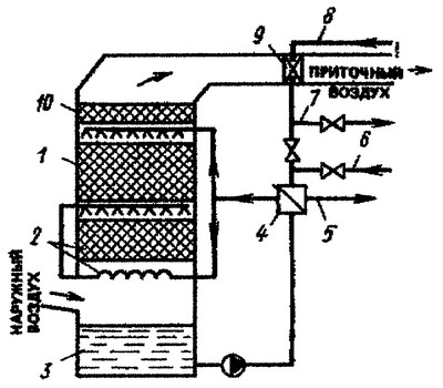 На многих предприятиях химической, машиностроительной и других отраслей промышленности на охлаждение технологического оборудования расходуется большое количество воды, температура которой затем достигает 35…40°С. Предложено использовать теплоту такой сбросной воды в приточных установках с применением утилизационных теплообменников контактного и поверхностного типа. Установка утилизации тепла оборудования снабжена системой защиты от обмерзания 2 и, кроме того, имеет повышенную плотность орошения нижней ступени двухступенчатого контактного теплообменника 1. Вода из системы охлаждения по трубопроводу 6 поступает в теплообменник 4, где отдает свою теплоту на нагрев воды, поступающей из поддона 3 в теплообменник 1 и систему защиты от обмерзания 2, и далее по трубопроводу 5 возвращается в систему охлаждения. Приточный воздух в теплообменнике 1 нагревается, проходит через каплеуловитель 10 и затем поступает в калорифер 9, где осушается и догревается до заданной температуры; калорифер подключен к системе теплоснабжения трубопроводами 7 и 8.