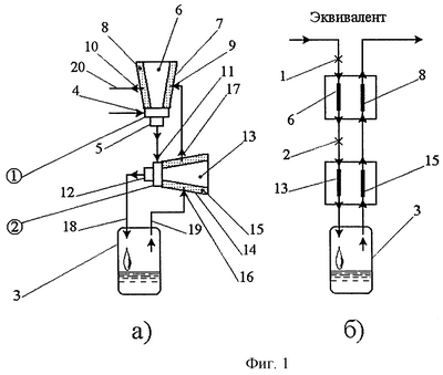 Если построить подобную схему холодильного устройства без использования вихревых труб, а на теплообменниках и обычных пневмодросселях, то такая эквивалентная схема может иметь вид (фиг.1-б). Нумерация эквивалентных элементов на этой схеме такая же, как и на фиг.1-а: